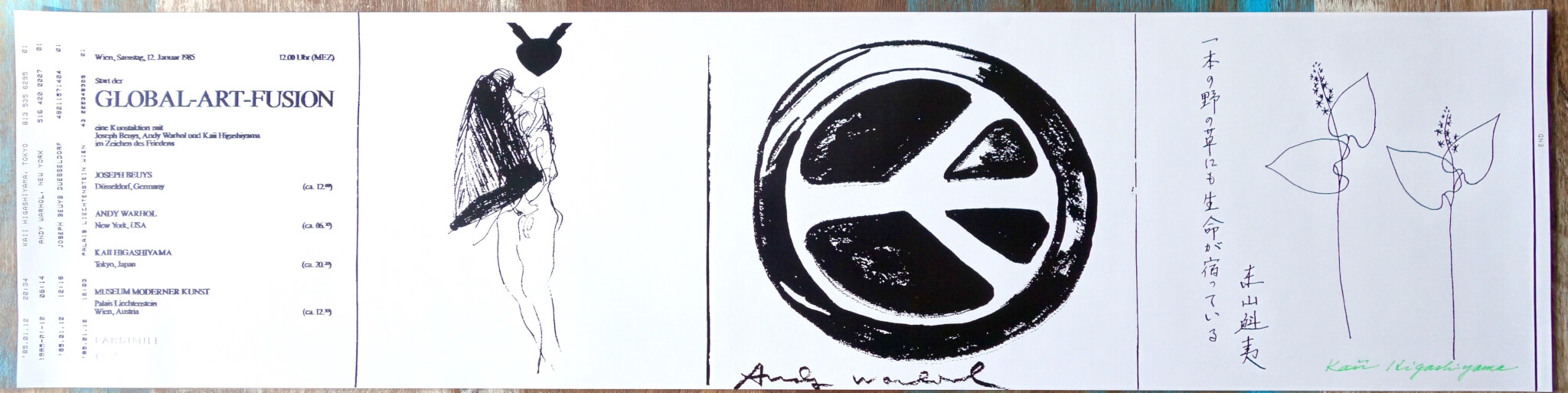 On January 12, 1985, Joseph Beuys together with Andy Warhol and the Japanese artist Kaii Higashiyama participated in the „Global-Art-Fusion“ project. This was a Fax-Art project, initiated by the conceptual artist Ueli Fuchser, in which a fax was sent with drawings of all three artists within 32 minutes around the world – from Dusseldorf (Germany) via New York (US) to Tokyo (Japan), received at Vienna’s Palais Liechtenstein Museum of Modern Art. This fax was a statement of peace during the Cold War in the 1980s.