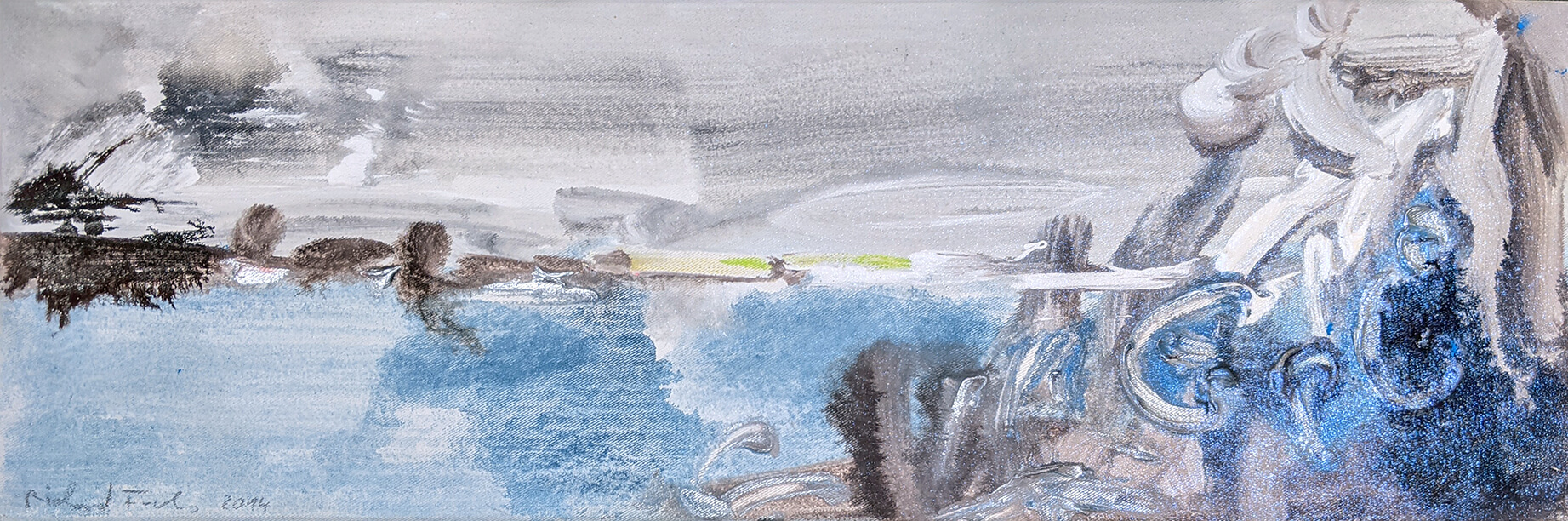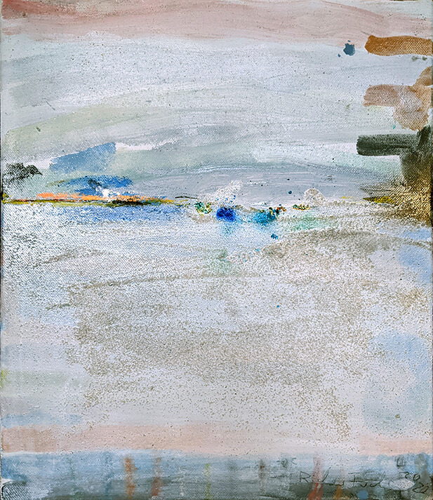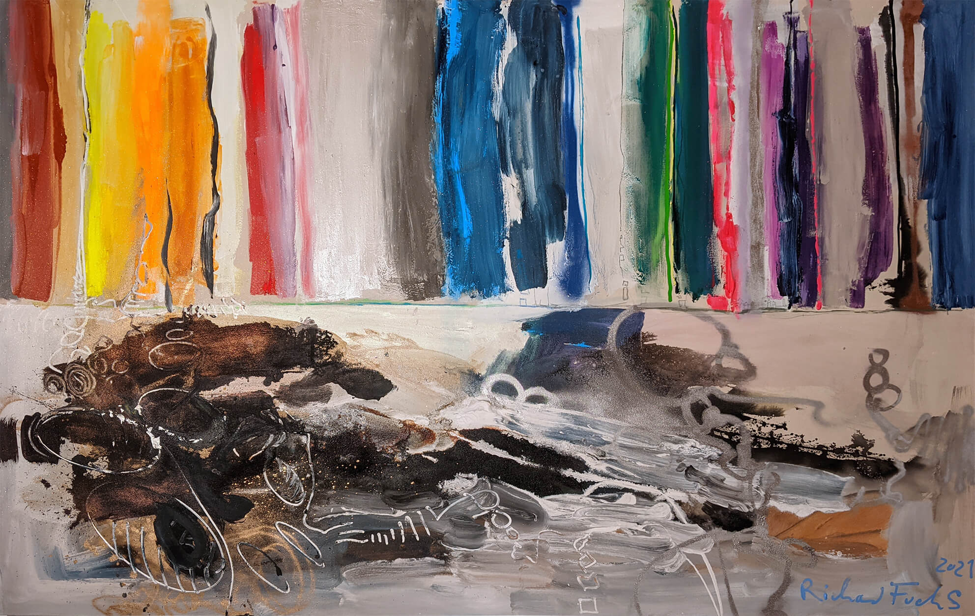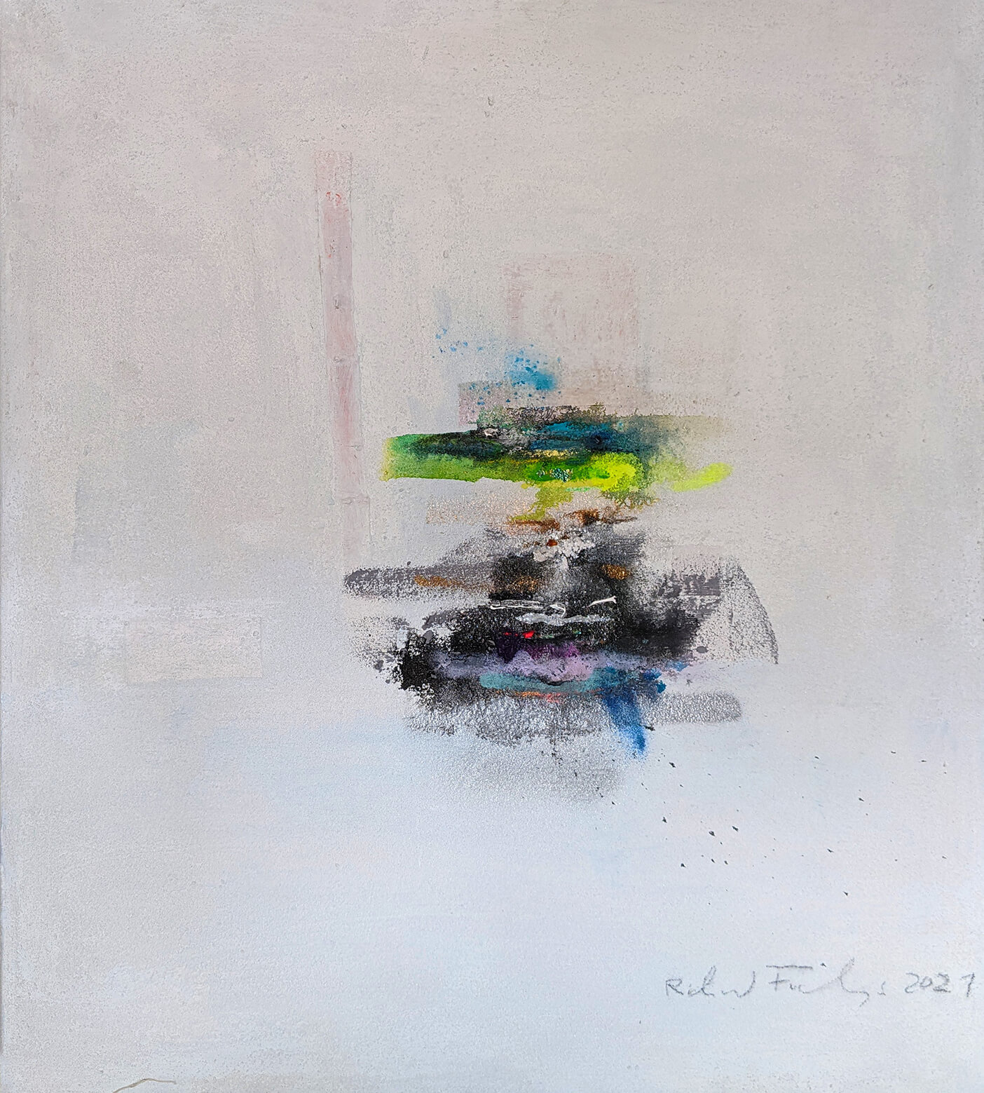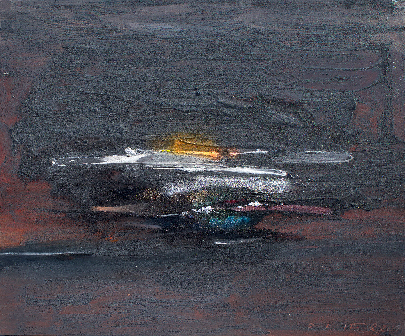Mein minimalistisches Werk ist malerisches Konzentrat –Atmosphäre, Intuition und Weite spiegeln den besonderen Moment: harmonierend mit Sand, Gestein, Vulkanasche, verschiedene Metalle, Mineralien und hochwertige Pigmente in Komposition. (R. FUCHS)