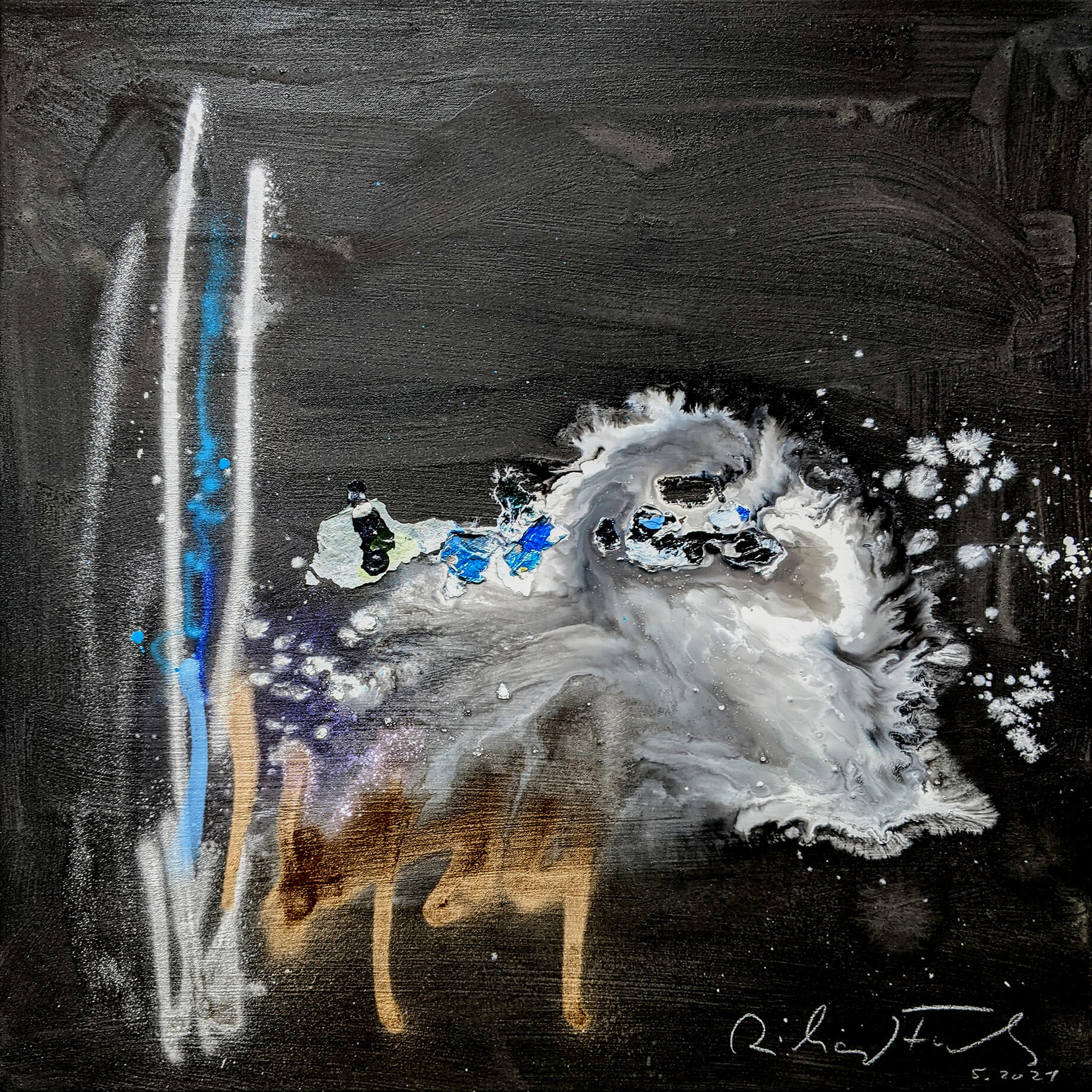 BLUE DEEP UNIVERSE, 100 x 100 cm | Jahr 2021 – Öl und Acryl, Marmormehl, Tusche, Sprühlack, Graphit, Pigmente auf Leinwand